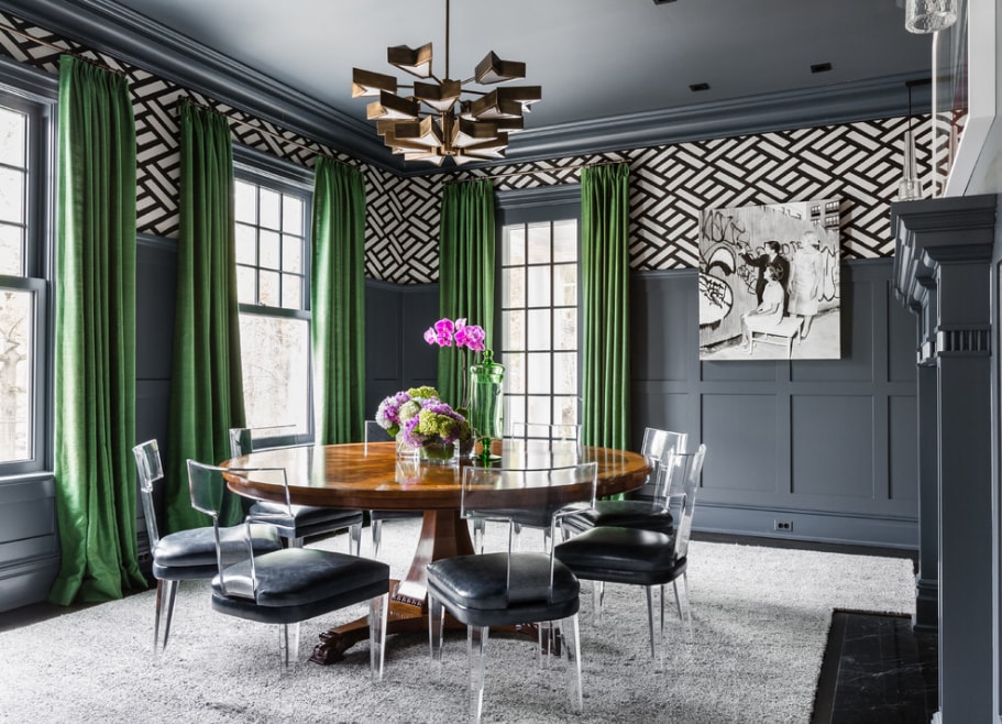 Пожалуй, самый смелый и необычный вариант сочетания – зеленые шторы в интерьере черного цвета. Безусловно это понравится не каждому. Но при грамотном подборе оттенков можно добиться потрясающего результата.