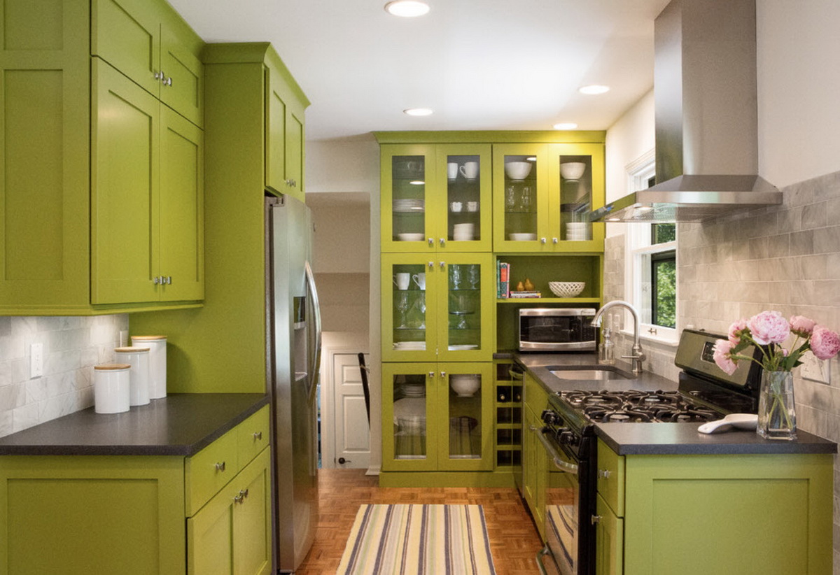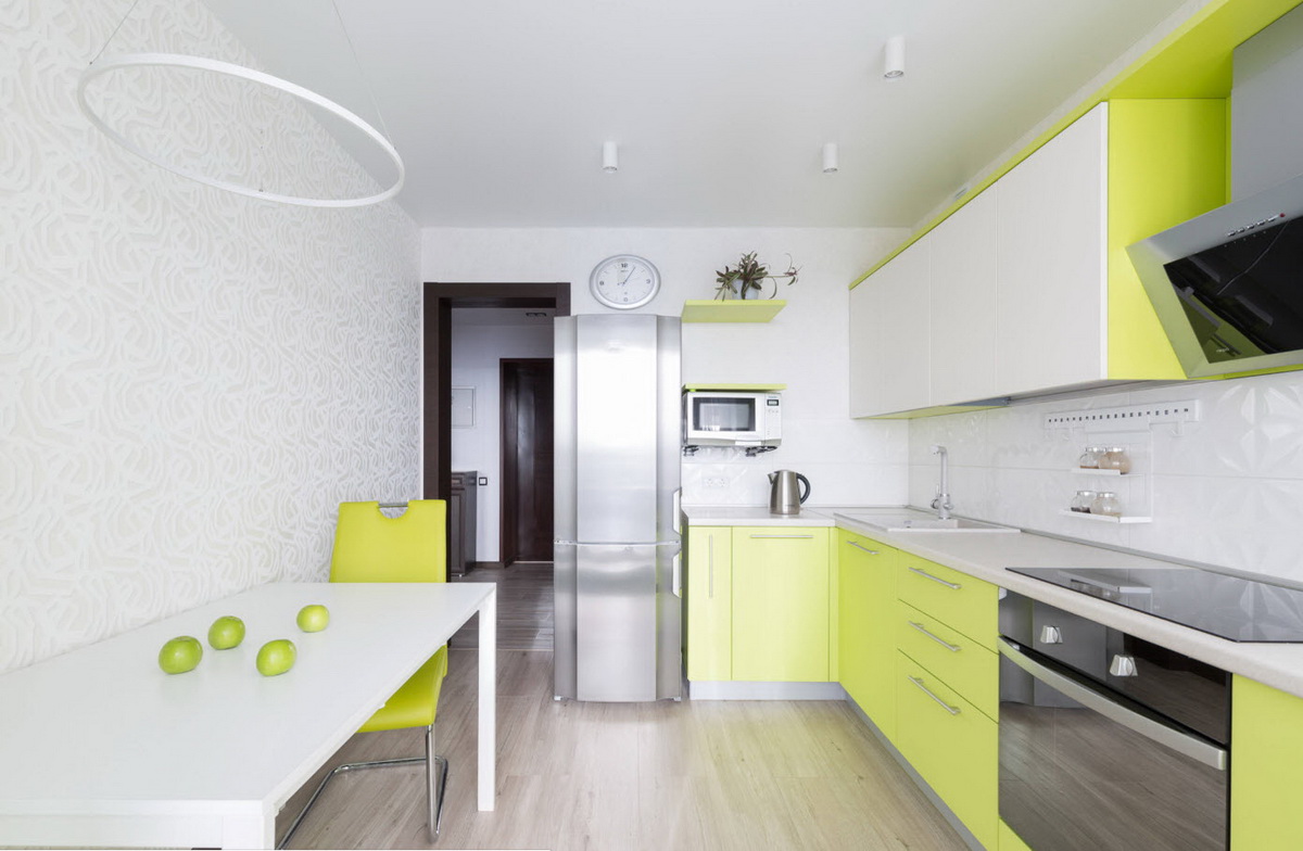 Еще один яркий и жизнеутверждающий оттенок. Он ассоциируется с весной, жизнью и молодостью. Кухня с салатовым гарнитуром получается красочной и сочной, она словно наполняется светом.