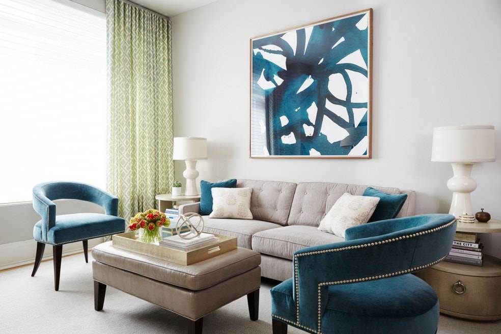 С серым. Вы можете взять за основу интерьера два цвета и варьировать их оттенками. Старайтесь, чтобы разница между ними была минимум 2-3 тона.