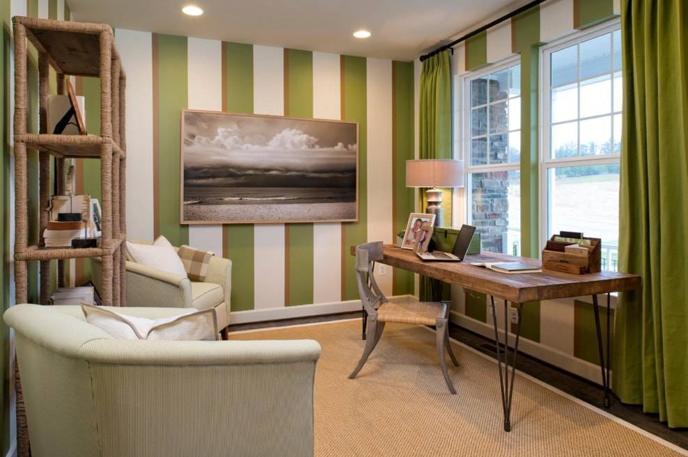 На серьезный лад могут настроить шторы оливкового цвета. Благородный оттенок придает энергию и стимулирует умственную деятельность. Приглушенный цвет отлично выполняет функцию основного фона классического или колониального стиля. Он отлично гармонирует с высокими потолками, тканями ярких зеленых цветов и отлично соседствует с серым. Полоска придает оригинальности и элегантности всей теме. Двухсторонние шторы можно сделать на более подкладке более светлого тона;