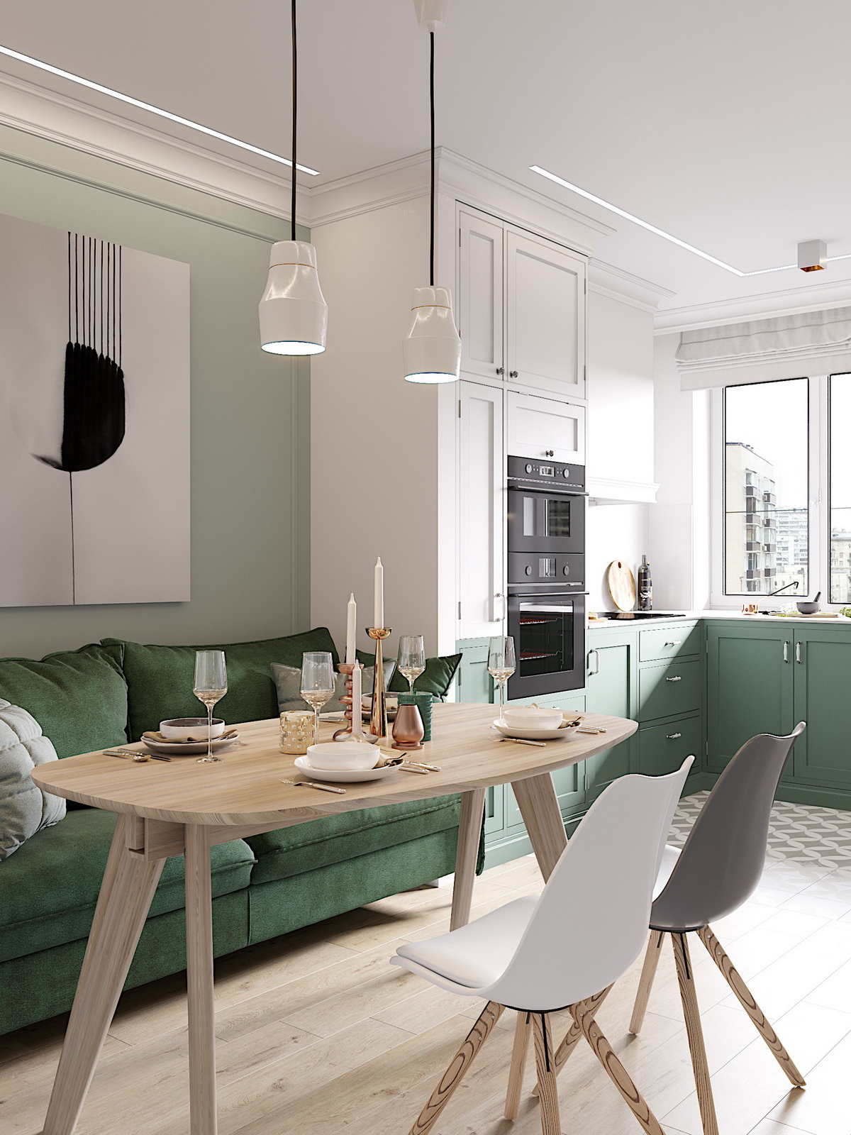 Правильно подобранный под общее оформление оттенок зеленых штор позволяет создать гармоничный и стильный интерьер. Цвет должен сочетаться с мебелью, элементами декора, покрытием пола и другими занавесками на окнах.