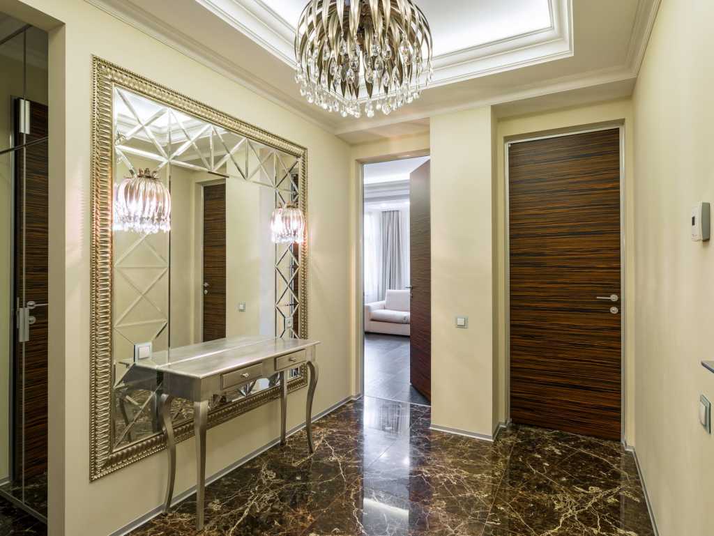 С точки зрения практичности расположение зеркала в прихожей довольно логично. Обычно стена в прихожей свободна, ничто не мешает обзору. Тем более, именно в коридоре мы одеваемся, и желаем напоследок посмотреть на свое отражение. Правда, если зеркало в довольно узком коридоре, то есть несколько аргументов против такого расположения. Во-первых, его можно повредить, задев поверхность сумочкой, зонтиком или даже коляской. Во-вторых, внося какие-то крупные предметы, например мебель, можно зеркало просто-напросто задеть и оставить как минимум скол. Да и в темноте зеркало можно нечаянно принять за входную дверь.