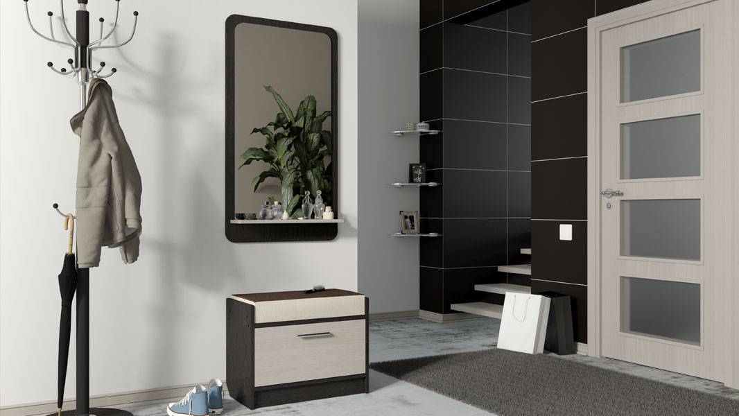 Большие отражающие поверхности визуально увеличивают пространство узкого коридора малогабаритных квартир, но их конструкция не должна быть напольной.