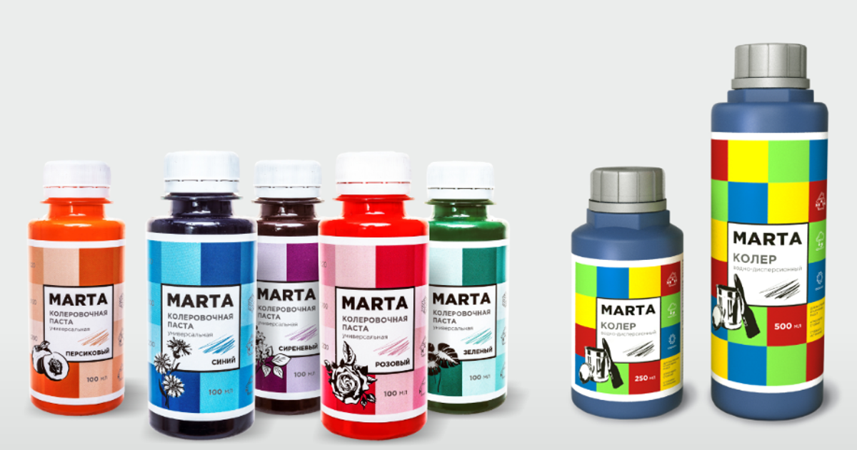 Европейские бренды представлены Farbex, Kolorit, Dufa (Германия), Дюфа, Текс, Униколер (отечественный производитель), Paritet Dekor (Франция), Dulux (Великобритания). Состав и форма колеров их продукции также разнообразна.
