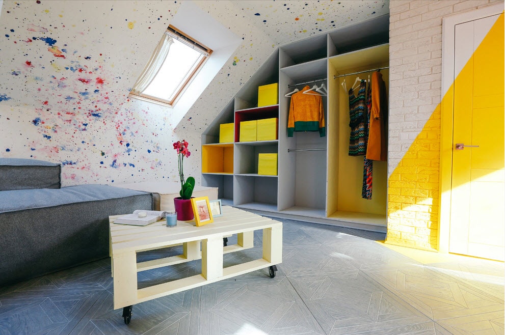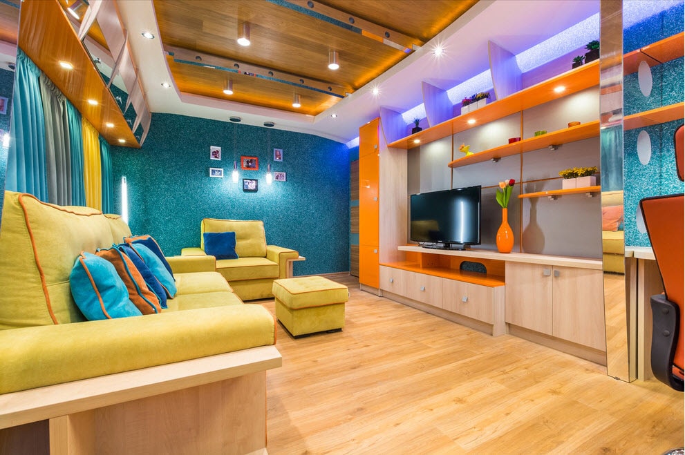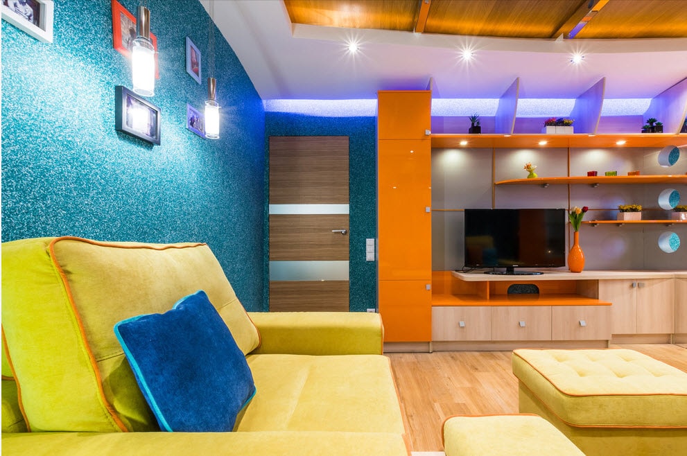 Смелая и неординарная идея – сочетание сразу нескольких цветов. Стену в таком случае лучше оформить в виде геометрического орнамента. Но учтите, что комната получится яркой