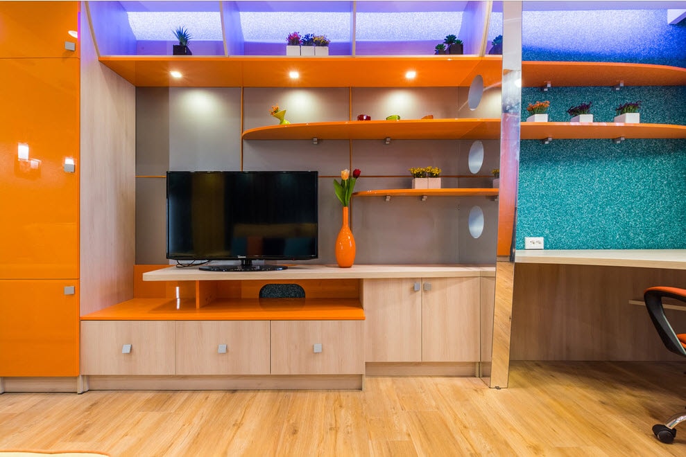 Цвет покрытия стен может совпадать с цветом мебели либо контрастировать с ним. Темная мебель будет особенно эффектна среди светлых стен, а выполненные из светлого материала предметы обстановки выигрышнее смотреться на фоне более темных.