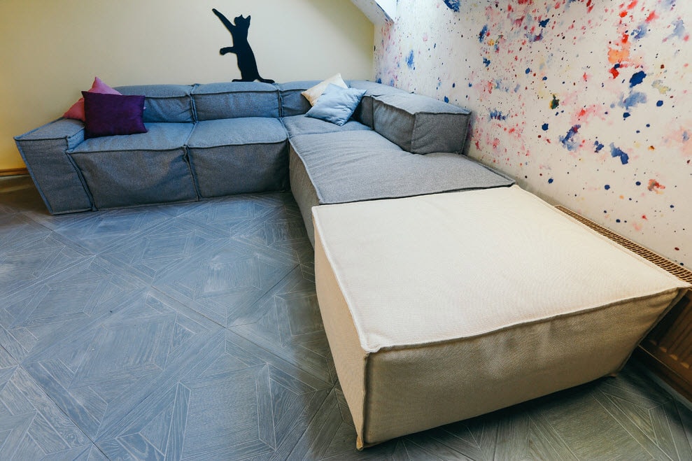 Или же попробуйте сделать имитацию состаренного бетона. Трещины, подтеки, неровности… На удивление, но результат выглядит стильно, хоть и немного неожиданно.