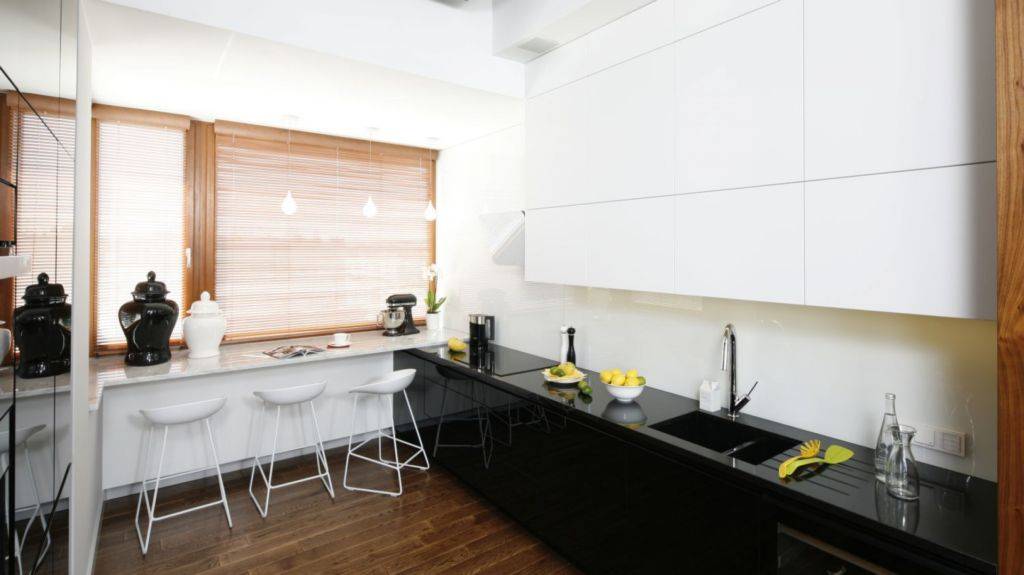 Решением может стать установка стекла только по зоне кухонного фартука. Этот прием позволит сохранить целостность дизайна и предотвратит чрезмерное загрязнение поверхности стен возле плиты и мойки.