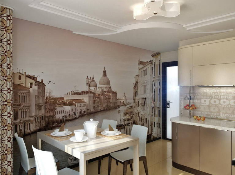 В дизайне интерьера с фотообоями крайне важно правильно выбрать к нему покрытие-компаньон, который обязательно должен сочетаться и с интерьером кухни, и с изображением. Как правило, это базовые, однотонные, сдержанные обои либо покраска