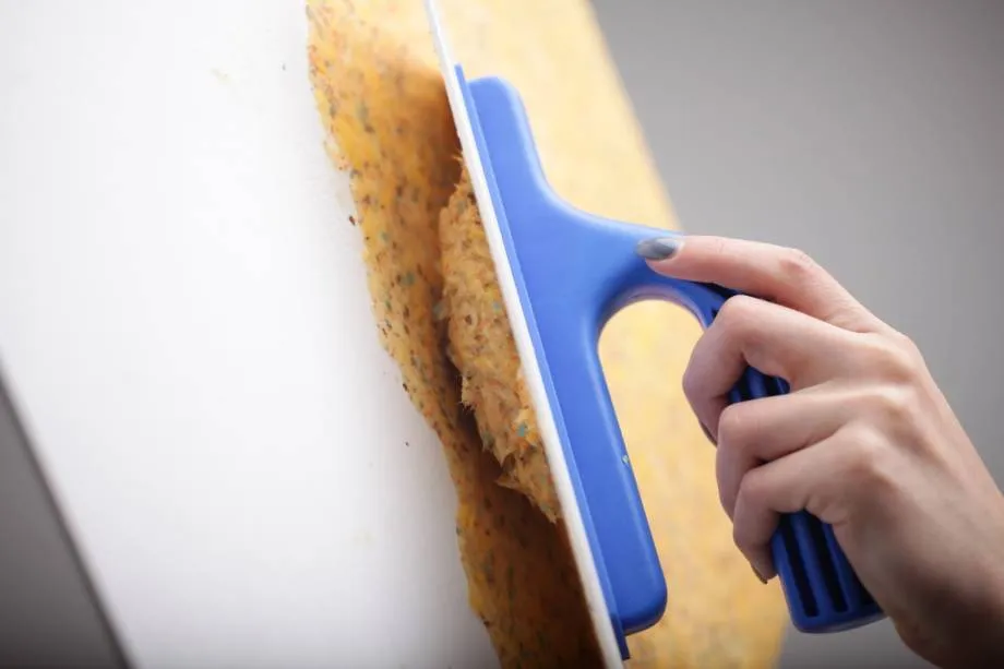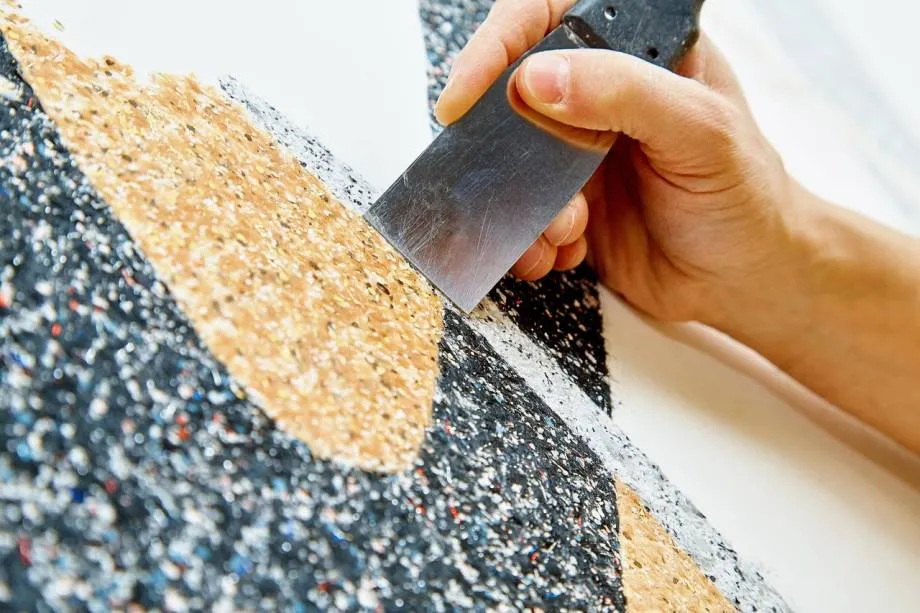 Для наклеивания обоев используется широкий шпатель или терка из прозрачного пластика, возможно – из нержавеющей стали. Сам процесс будет напоминать шпаклевание.Для нанесения таких обоев нужно работать шпателем или кельмой. т.е. массу обоев кладут на инструмент, сначала грубо разложив по стене, а затем равномерно разглаживая.