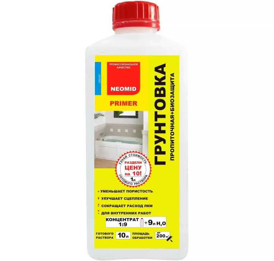 Когда ровнитель высохнет, основание нужно будет пропитать адгезионной грунтовкой. Если стены сильно впитывают влагу, то лучше взять пропиточный состав, нанести его в 2-3 слоя.