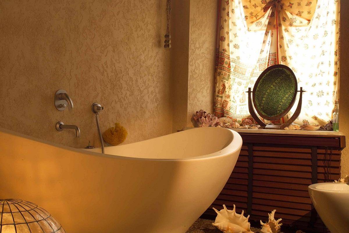 Стены средиземноморской ванной комнаты оклеены необычными матовыми обоями черного цвета, на фоне которых отлично смотрятся серебристые аксессуары и дизайнерский умывальник из натурального, не обработанного камня. Тусклое, не яркое освещение создает в комнате загадочную и таинственную атмосферу, при этом помещение не выглядит мрачным и зловещим.