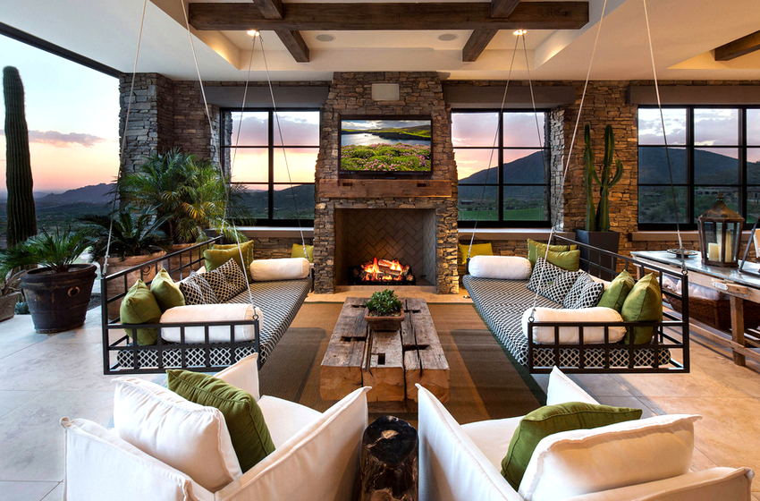 Лучше всего такой минимальный набор дополнить шезлонгом, гамаком, креслом-качалкой. Популярность сейчас набирают также подвесные кресла-коконы, которые добавляют в любой интерьер изюминку.