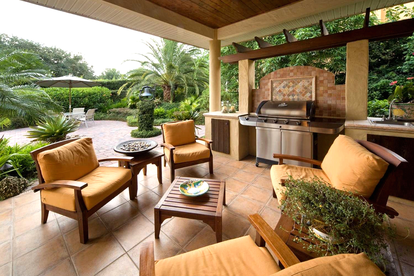 - если разместить зону отдыха с мангалом в патио, получится надежно укрыться от ветра за стенками дома;