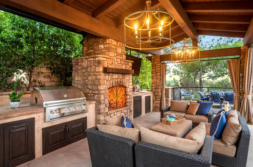 - закрытая зона обустраивается стационарным очагом, имеет навес и стены. Часто для организации такой зоны отдыха служит беседка или терраса, которые фактически превращаются в удобную летнюю столовую, где будет комфортно готовить пищу и обедать при любых погодных условиях;