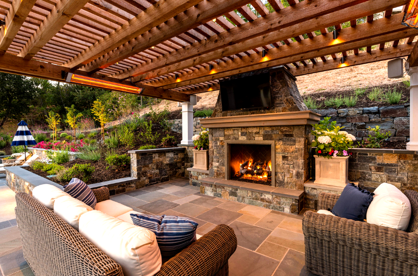 - Беседки-патио чаще всего оформляются в итальянском или греческом стиле с использованием камня или дерева для отделки. Подойдет компактная мебель и цветки в горшках.