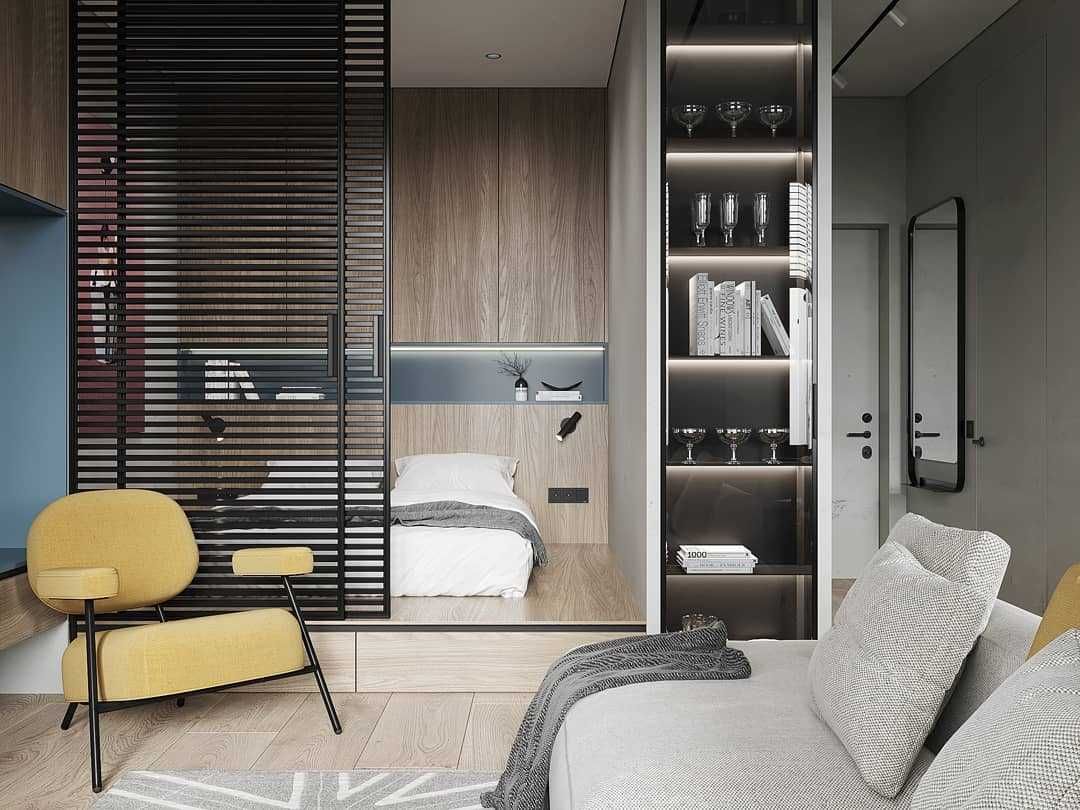Для спального места отгорожена комнатка с раздвижными стеклянными дверями. В данном примере нельзя однозначно сказать, что гостиная и спальня совмещены, но они очень близко и легко «соединяются» при открытых дверях.